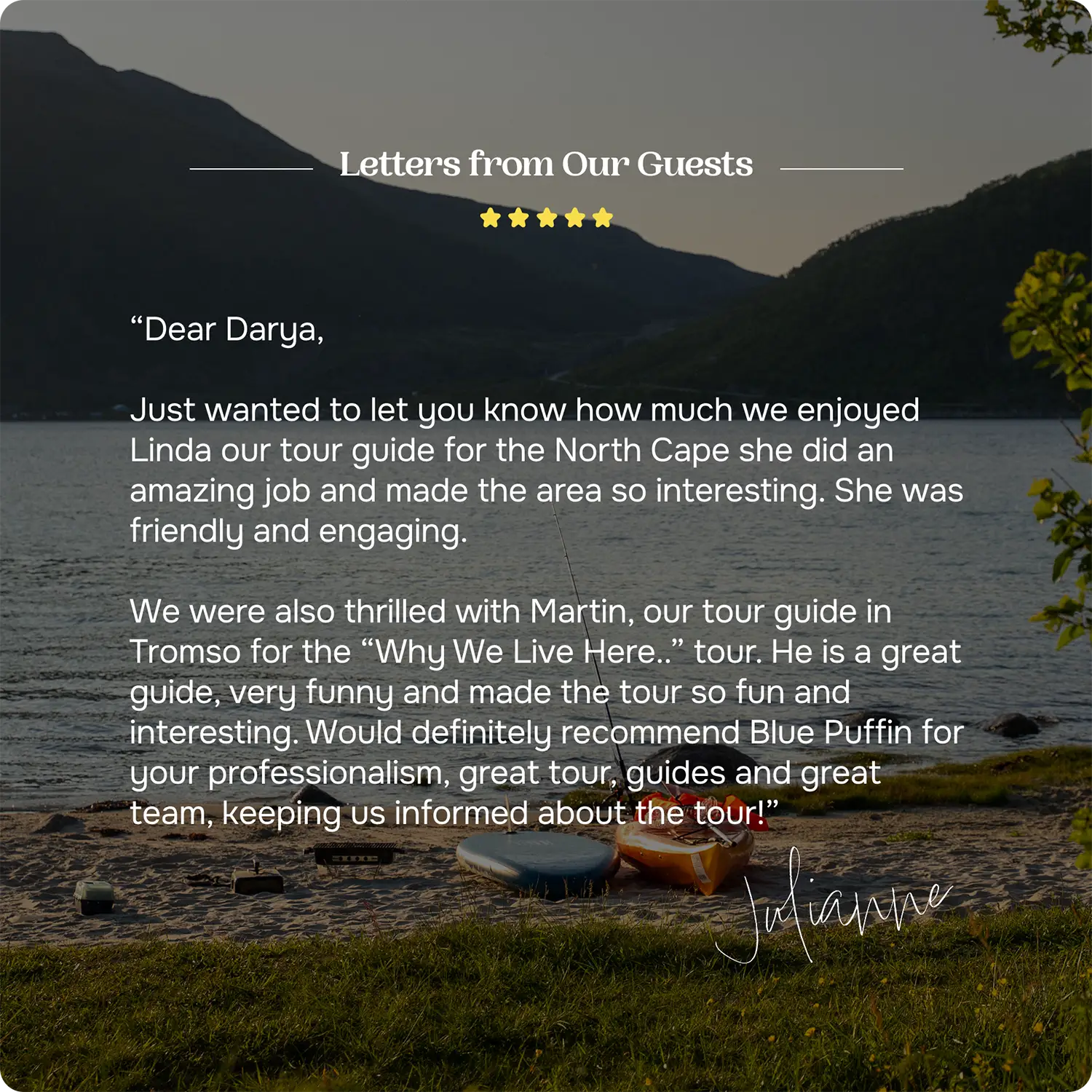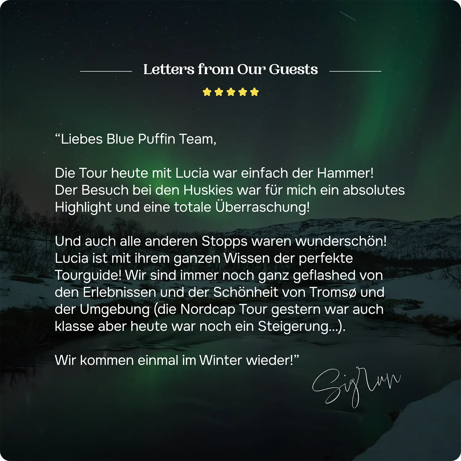 Wir folgen keinem Skript und keiner perfekten Routine. Wir guiden mit Herz. Für uns geht es um Menschen, ums Zuhören und Teilen, darum, aus einer Busfahrt oder einem Spaziergang im Schnee etwas Echtes zu machen, eine Verbindung. Was wir schätzen, ist dieser kleine magische Moment, wenn Geschichten, Wetter und die Arktis zusammenkommen und etwas ganz Besonderes entsteht.